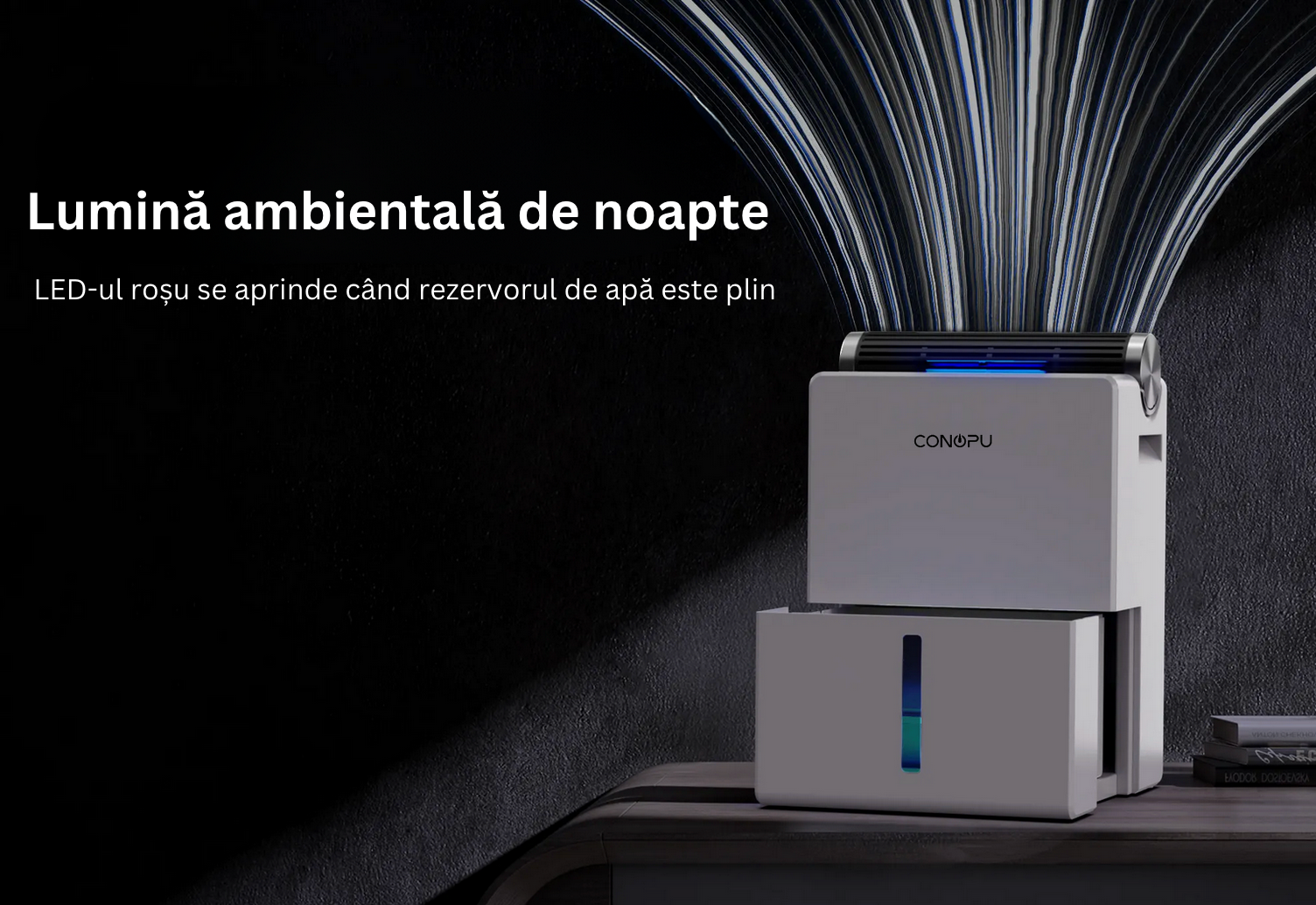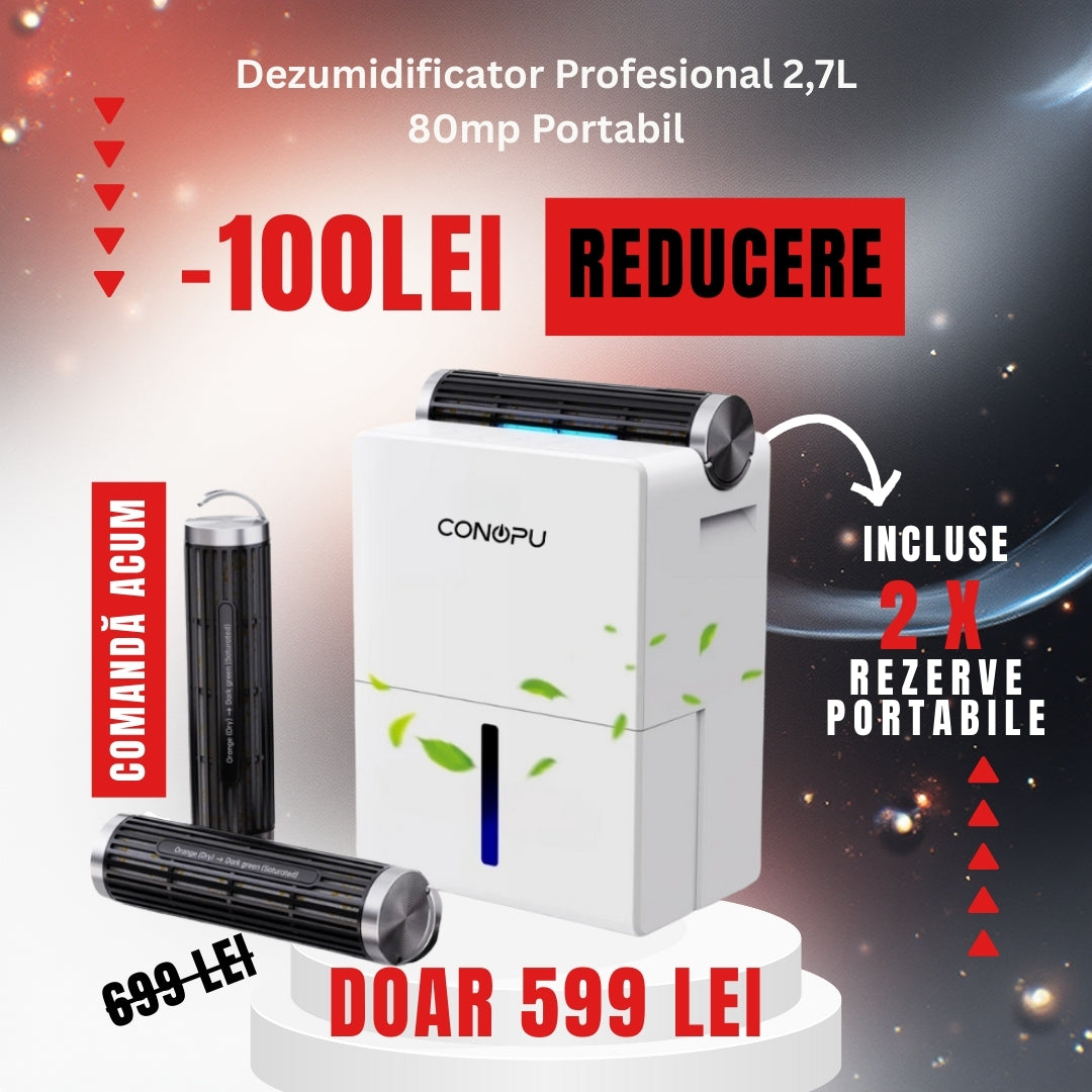 Dezumidificatorul Conopu extrage umezeala din aer, menținând nivelul de umiditate optimal în încăpere. Acesta folosește un sistem eficient de condensare pentru a reduce excesul de umiditate, contribuind la un mediu mai sănătos și confortabil.