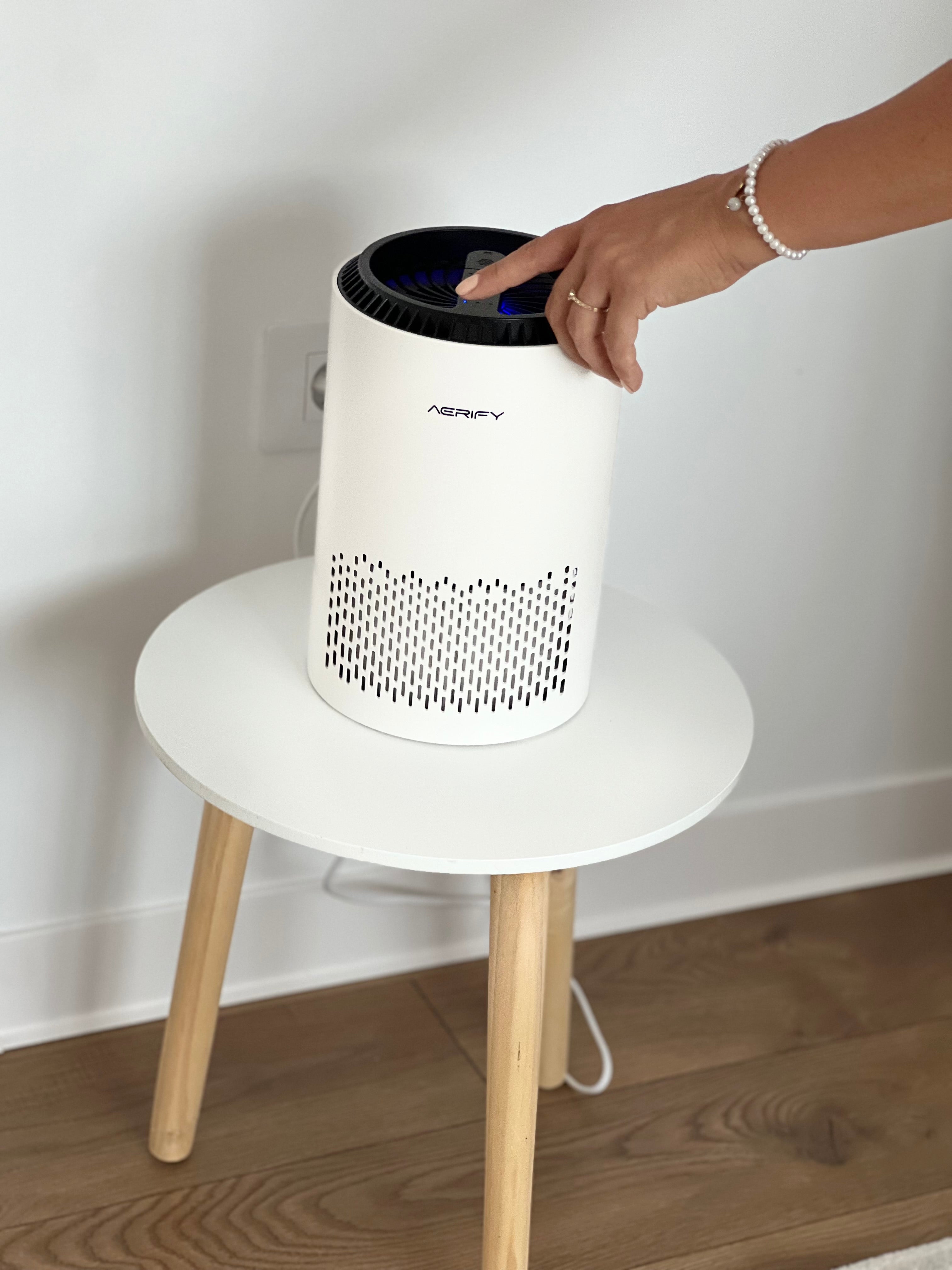 Purificatorul nostru de aer AERIFY funcționează prin atragerea aerului printr-un filtru de înaltă eficiență, care captează 99,97% din particulele fine, cum ar fi praf, polen și alergeni, eliberând apoi aer curat în încăpere.